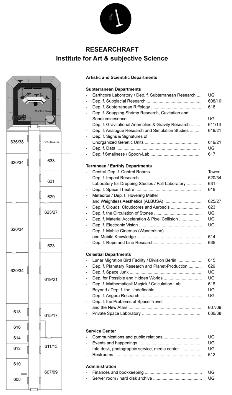 Originally founded by the artist Agnes Meyer-Brandis 10 years ago, the ResearchRaft is a permanently altering meta-installation in the shape of an "Institute for Art and subjective Science". It is a modular construct build of experimental formats from art, science, theater and movies. It also connects to artistic projects and research movements of all sorts. The institute understands itself as an installation to enter as well as a laboratory, workshop, science center and a poetic archive with the ability to peregrinate and sprawl.